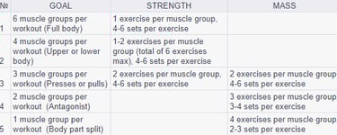 When creating your own workout programs using these tables, you can incorporate specific exercises based on your goals. However, it's important to note that the "strength-mass" divisions in the table are general guidelines. For example, a full-body workout is an excellent option for a beginner looking to increase muscle mass, even though it's categorized under "strength" in the table. Additionally, the tables do not include a category for "Hypertrophy" goals. In this case, you can apply exercises similar to those in the "mass" category, but keep in mind that there is a wide variety of options for designing workout programs for "hypertrophy" goals (circuit training, different complexes, functional training, cardio, interval training, etc.). Therefore, it's not as straightforward. These table options should only serve as a starting point, and you should consider your individual characteristics.